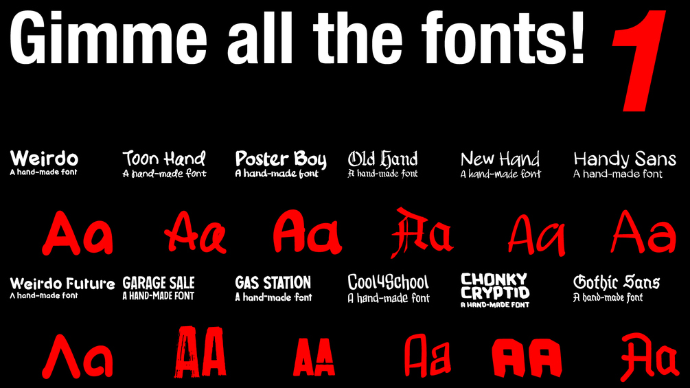 Get every font and save, save, save! This package contains Old Hand, New Hand, Handy Sans, Toon Hand, Gothic Sans, Garage Sale, Gas Station, Poster Boy, Chonky Cryptid, Cool4School, Weirdo and Weirdo Future.